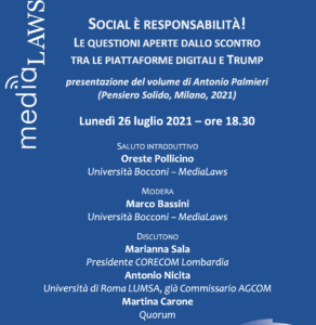 Appuntamento il 26 luglio alle 18.30 per discutere del potere e della responsabilità dei social media, in particolare dopo lo scontro e l’esclusione da Twitter e Facebook dell’ex Presidente degli Stati Uniti Donald Trump. Nell’incontro, che permetterà di fare il punto su libertà di espressione e potere delle piattaforme digitali, sarà presentato il volume di Antonio Palmieri “Social È Responsabilità!”. Dopo i saluti di Oreste Pollicino, dell’Università Bocconi e Direttore della Rivista MediaLaws, interverranno Marianna Sala, Presidente del Corecom Lombardia, Antonio Nicita, dell’Università Lumsa e già Commissario AGCOM e Martina Carone, di Quorum. Conclude Antonio Palmieri, autore del libro e deputato; modera Marco Bassini dell’Università Bocconi.