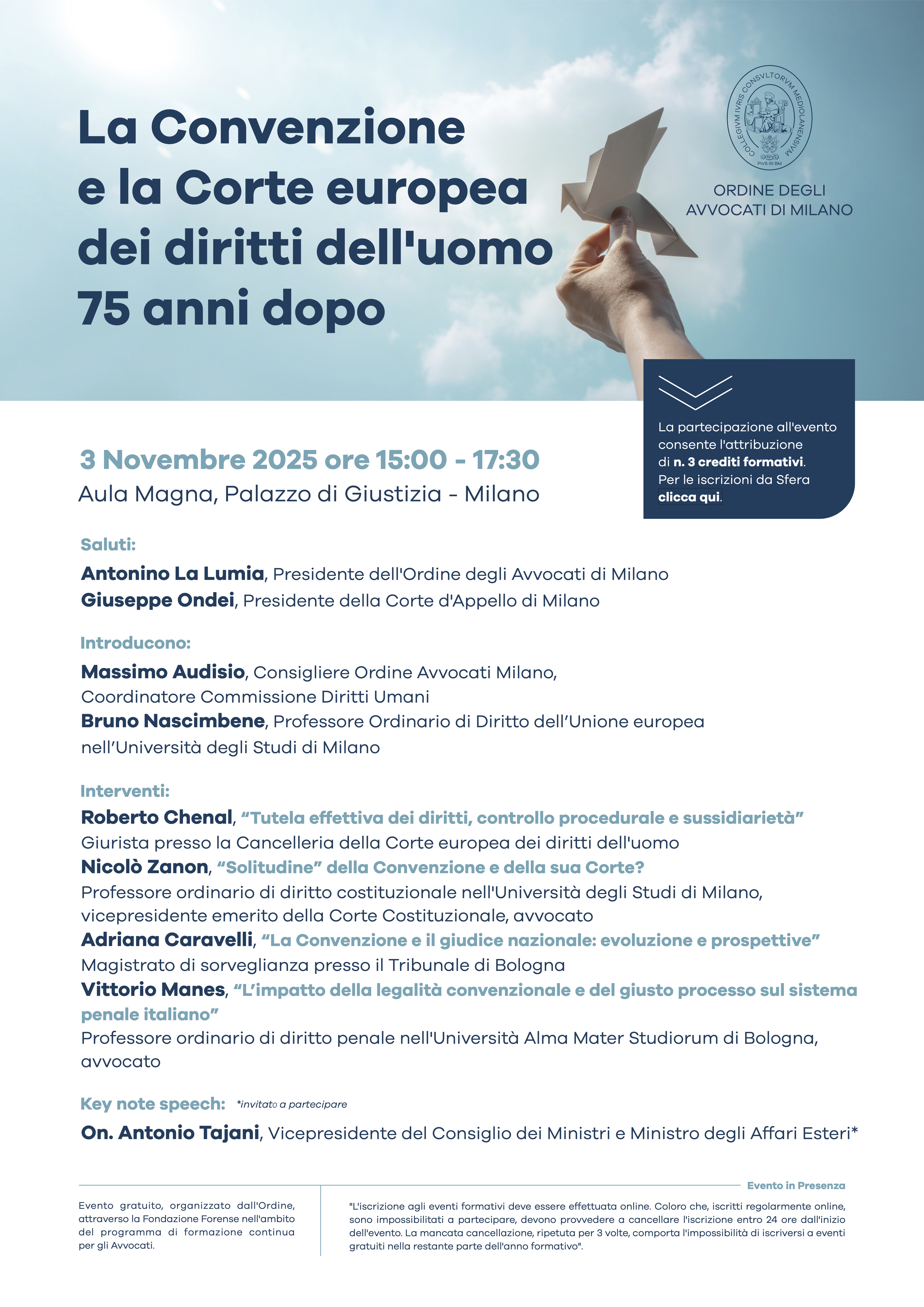 “La Convenzione e la Corte europea dei diritti dell’uomo 75 anni dopo”: è il titolo del convegno che si terrà il 3 novembre a Milano, nell’Aula Magna del Palazzo di giustizia. Molti i temi trattati: si parte alle 15.00 con gli interventi introduttivi di Massimo Audisio, Consigliere dell’Ordine degli Avvocati di Milano e Bruno Nascimbene, professore emerito di diritto dell’Unione europea dell’Università degli studi di Milano.