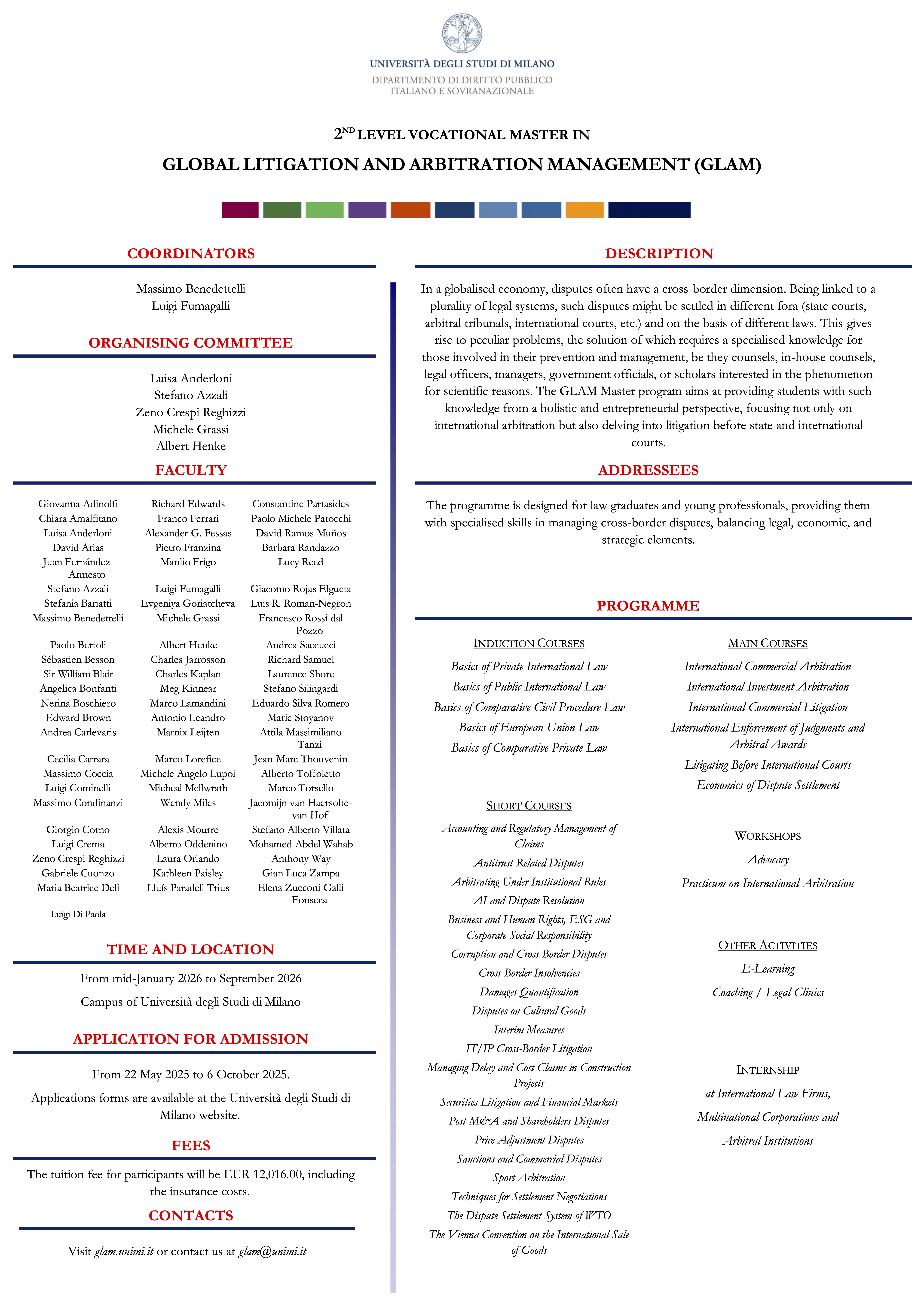 C’è tempo fino al 6 ottobre 2025 per iscriversi al Master in “Global Litigation and Arbitration Management (GLAM)” (https://glam.unimi.it/), organizzato dal Dipartimento di diritto pubblico italiano e sovranazionale dell’Università di Milano e coordinato dai professori Massimo Benedettelli e Luigi Fumagalli.